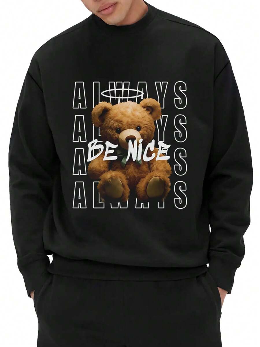 Men'S Round Neck Drop Shoulder Sleeve Casual Sweatshirt With Text & Cartoon Print
