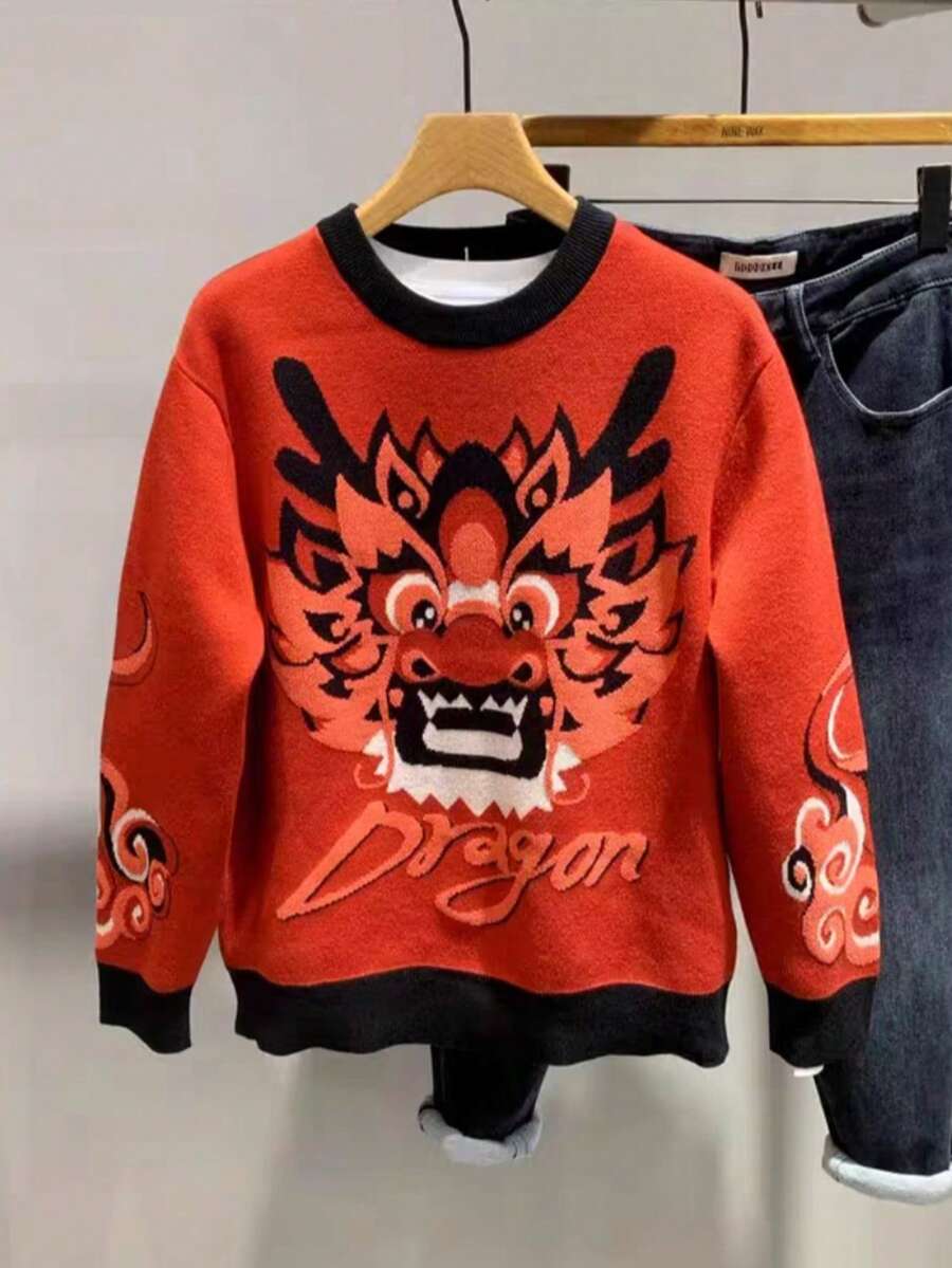 Men'S Round Neck Sweater With Dragon Pattern