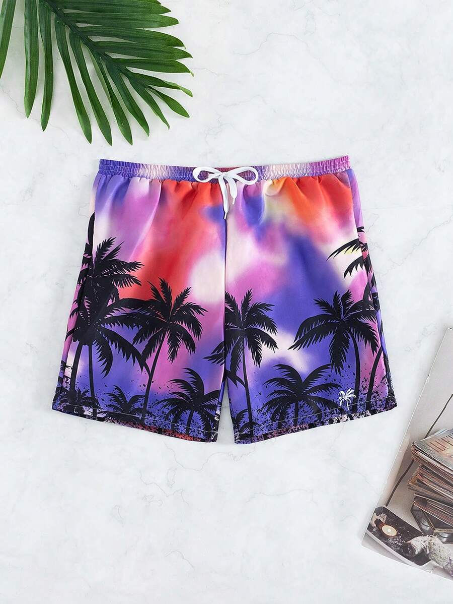 SHEIN Men'S Tropical Printed Tie Dye Drawstring Waist Beach Shorts