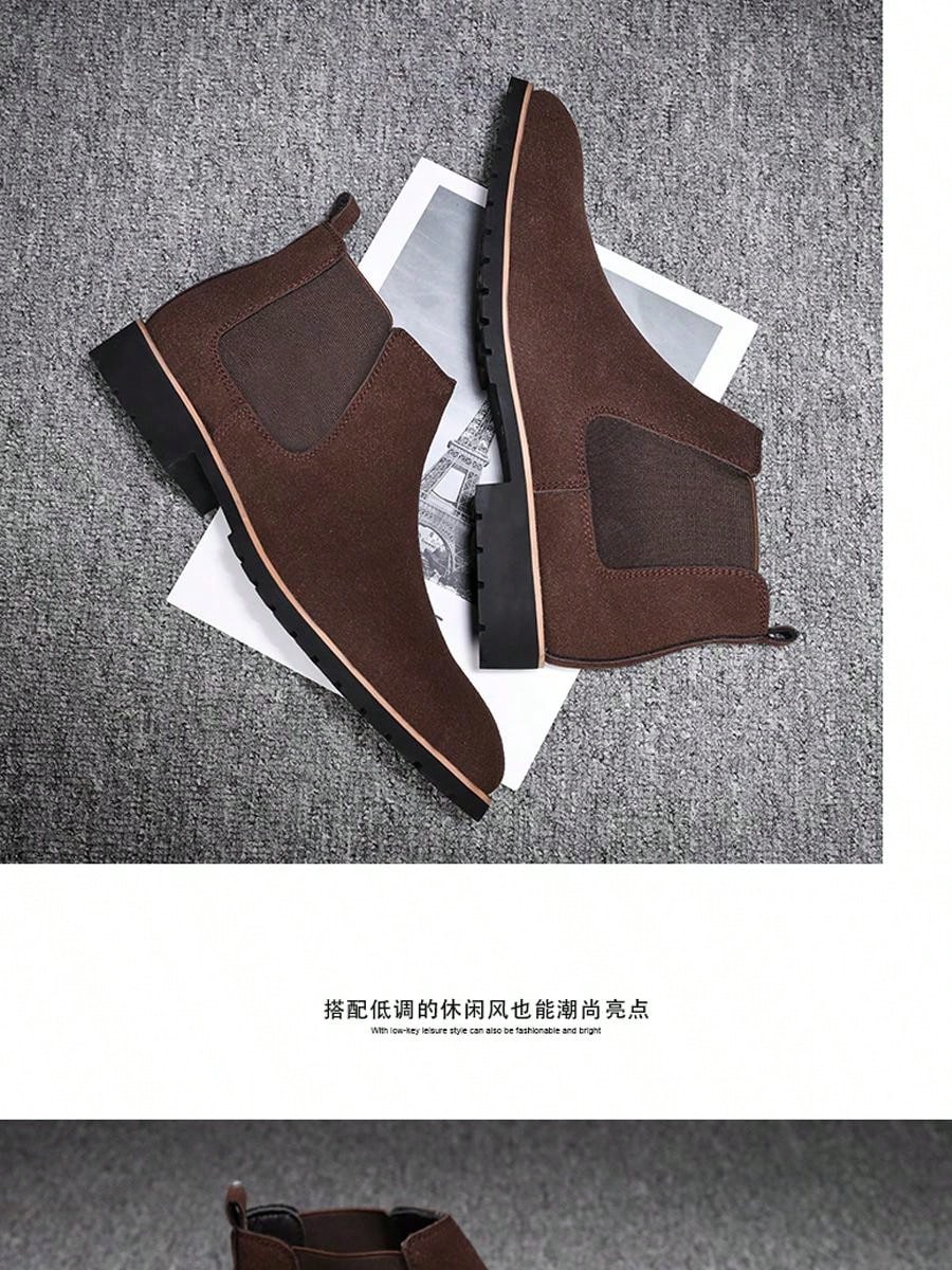 Men's Mid-high Slip-on Chelsea Boot, Spring Autumn, Large Size, Solid Color, Versatile, Fashionable, Casual, Outdoor Work Boot, Brown With Contrast Stitching