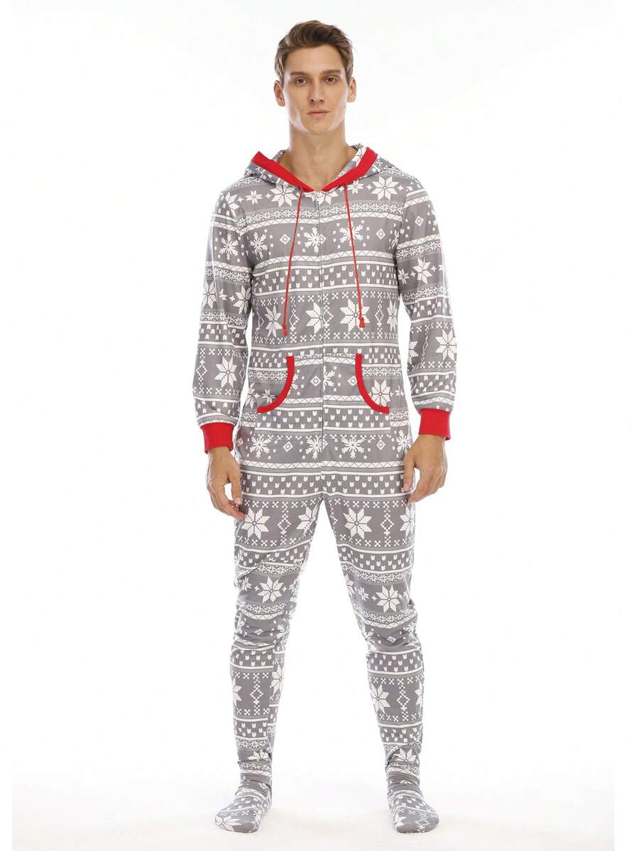 Men's Printed Long Sleeve Jumpsuit Pajamas, Autumn, Grey