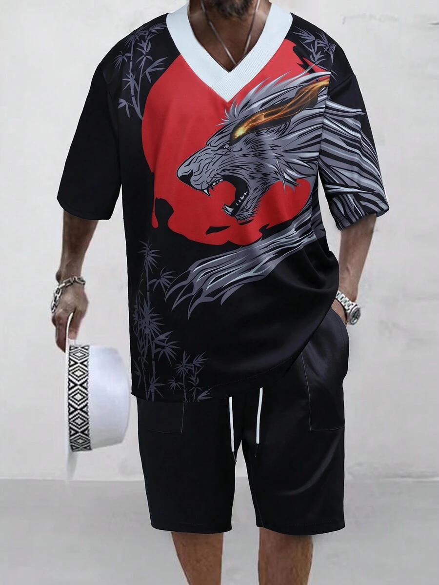 Manfinity LEGND Men Animal Print Contrast Trim Tee & Drawstring Waist Shorts