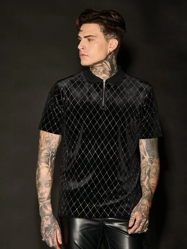 Manfinity AFTRDRK Men Argyle Pattern Quarter Zip Velvet Polo Shirt