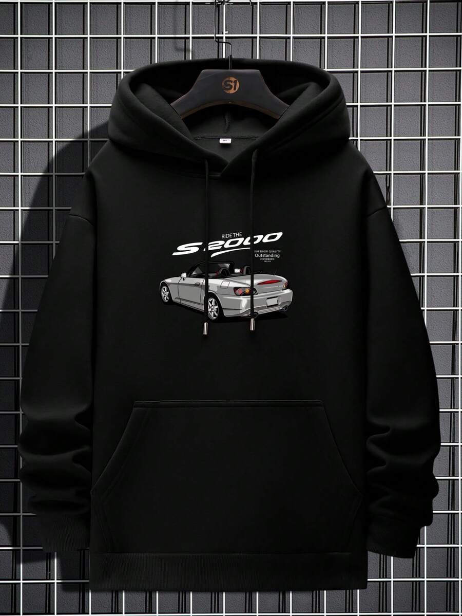 Men Car & Letter Graphic Kangaroo Pocket Drawstring Hoodie
