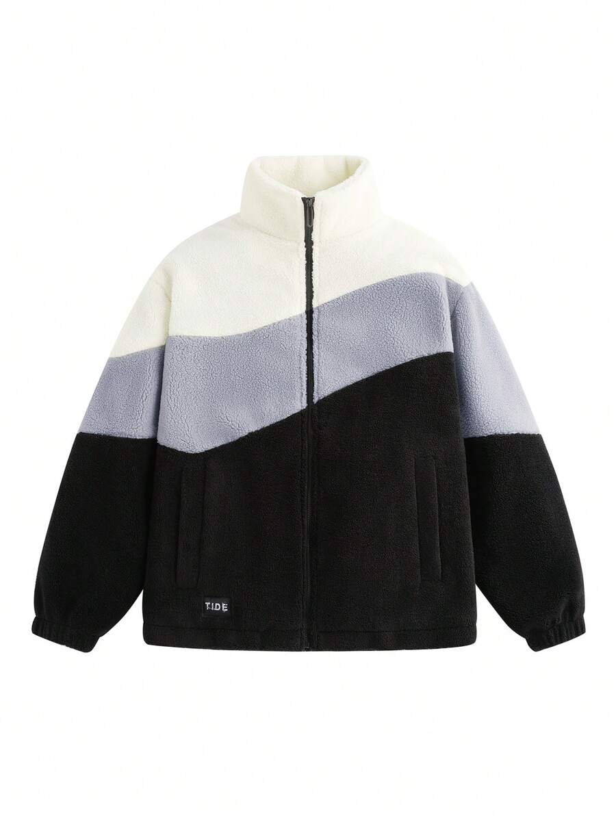 Men Color Block Letter Patched Detail Teddy Jacket