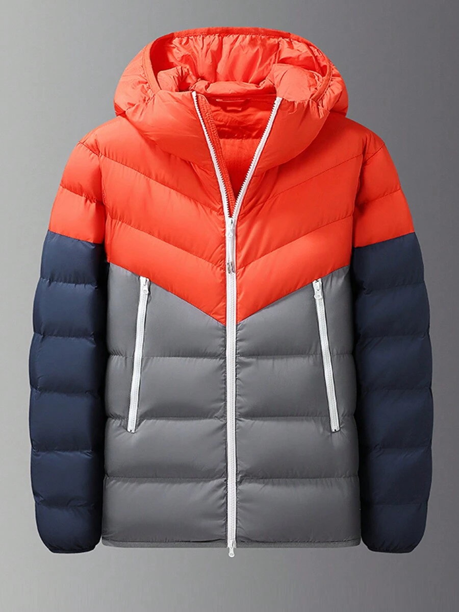 Men Colorblock Drawstring Hooded Puffer Coat