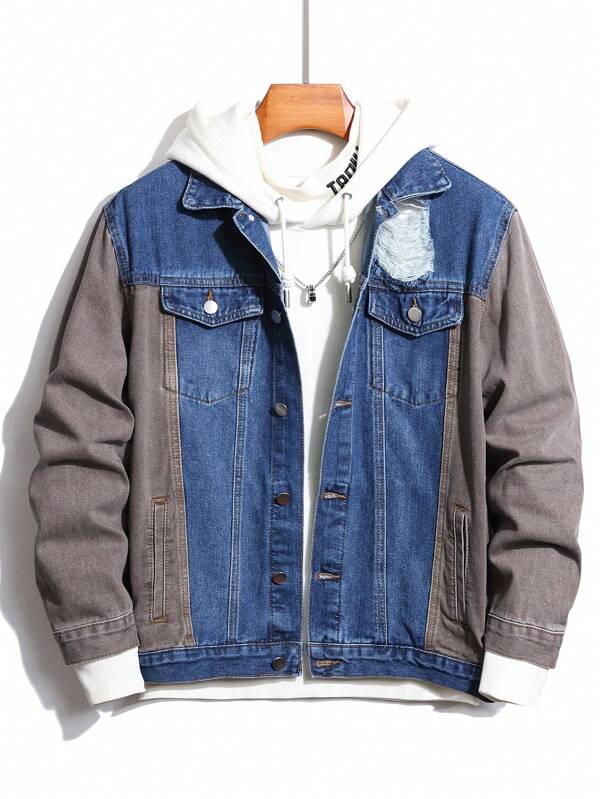 Manfinity EMRG Men Colorblock Ripped Flap Pocket Denim Jacket Without Hoodie