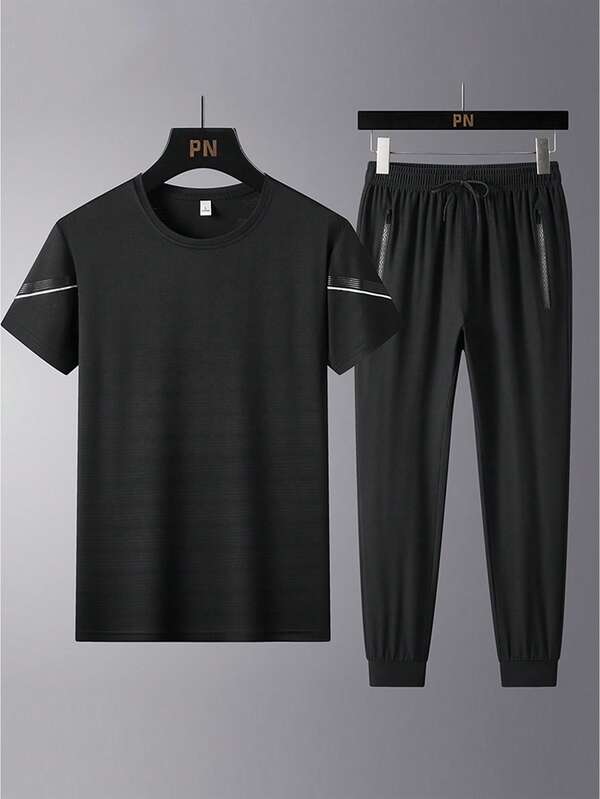 Men Contrast Tape Tee & Drawstring Waist Sweatpants