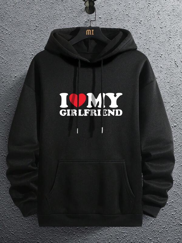 Valentine's Day Men Heart & Slogan Graphic Kangaroo Pocket Drawstring Thermal Hoodie
