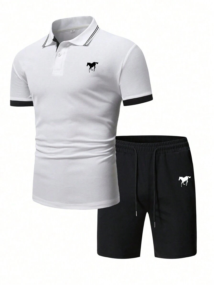 Manfinity Mode Men Horse Print Contrast Trim Polo Shirt & Drawstring Waist Shorts
