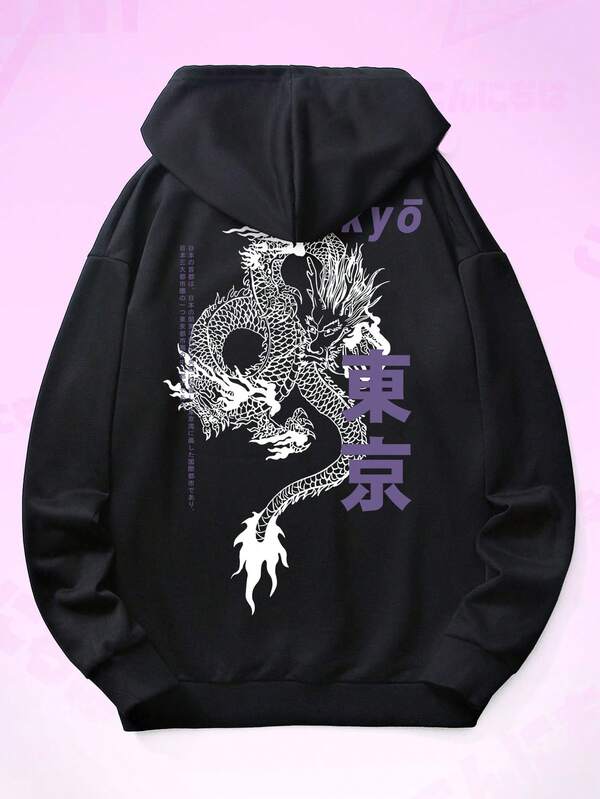 ROMWE Anime Men Letter Dragon Graphic Kangaroo Pocket Drawstring Hoodie