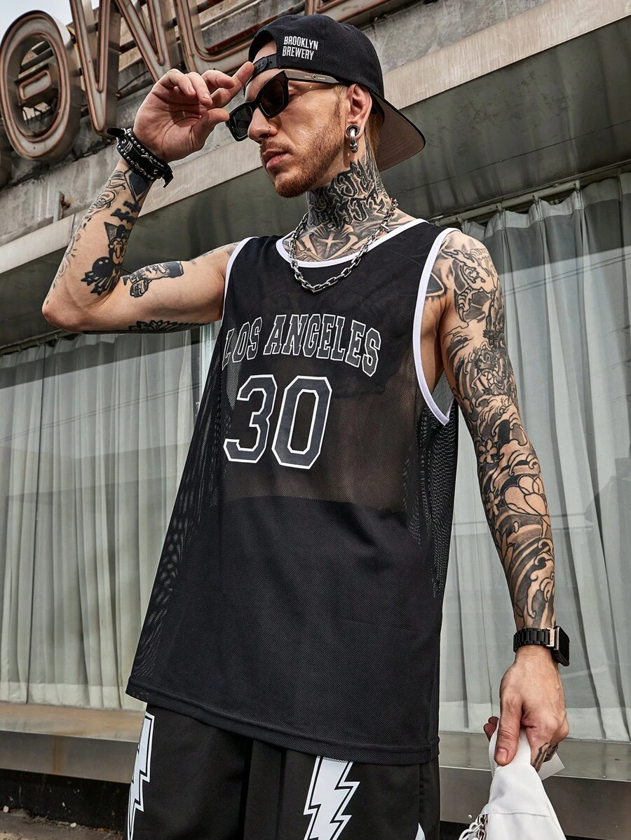 Manfinity RSRT Men Letter Graphic Contrast Binding Mesh Tank Top