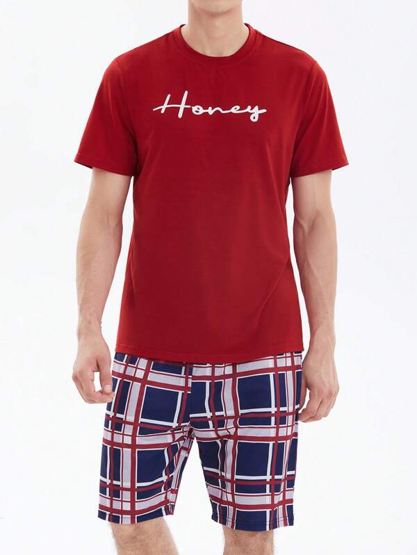 Men Letter Graphic Tee & Plaid Shorts PJ Set