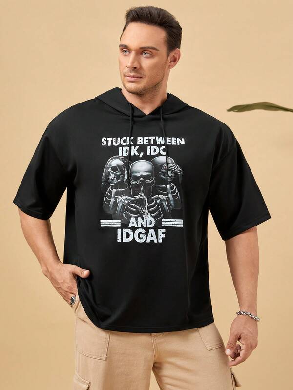 Manfinity LEGND Men Plus Slogan & Skull Graphic Drawstring Hooded Tee