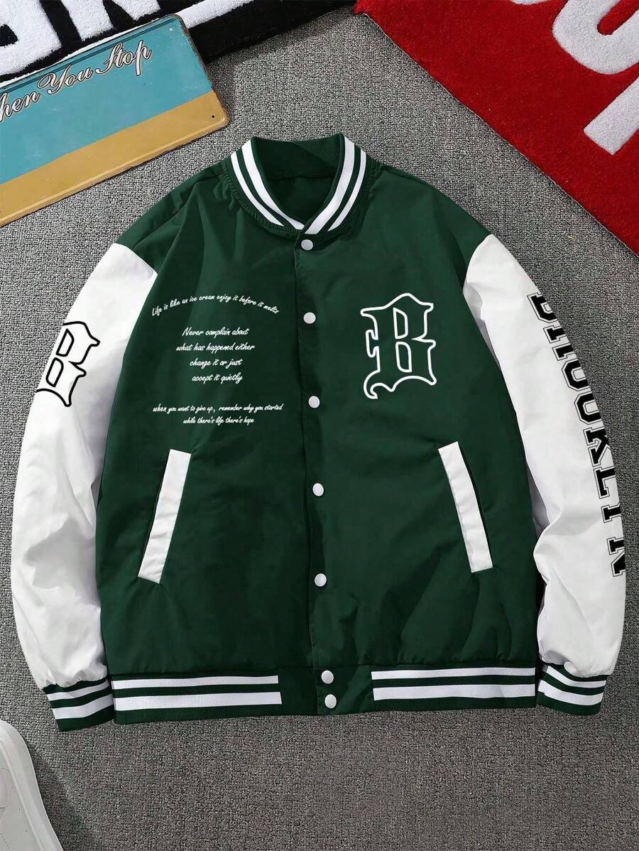 Manfinity Men Plus Slogan Graphic Striped Trim Varsity Jacket