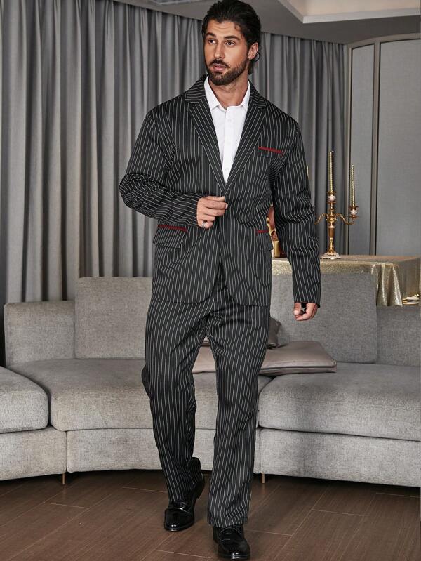 Extended Sizes Men Plus Striped Print Single Button Blazer & Suit Pants