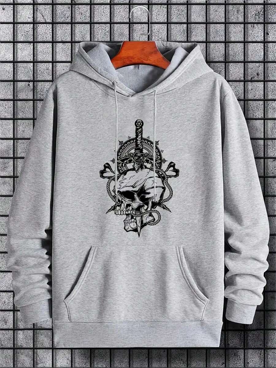 Men Skull Print Kangaroo Pocket Drawstring Thermal Lined Hoodie