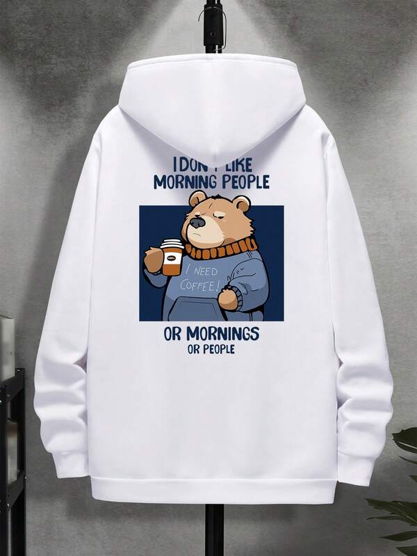 Men Slogan & Cartoon Bear Graphic Drawstring Hoodie