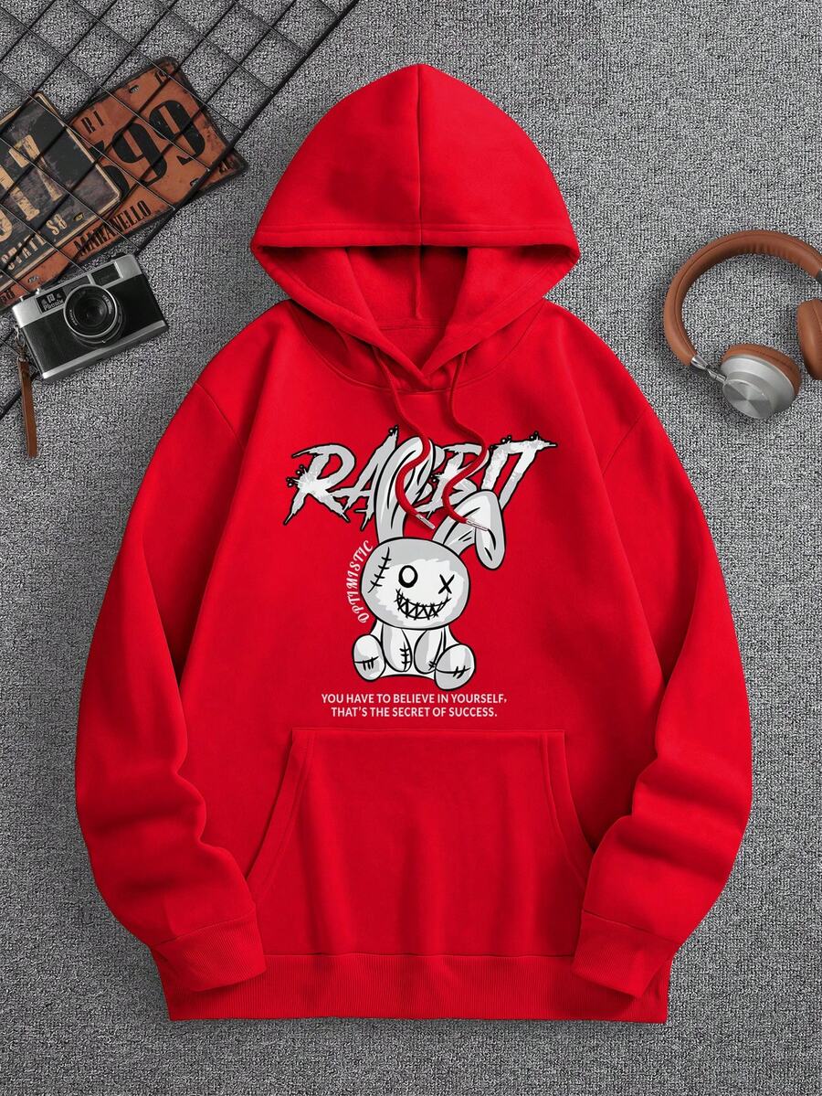 Men Slogan & Cartoon Graphic Kangaroo Pocket Drawstring Thermal Lined Hoodie