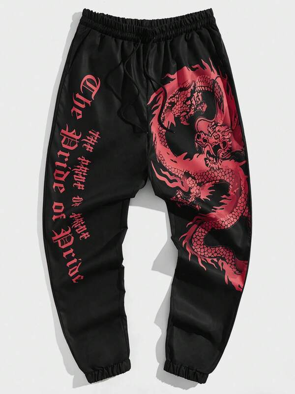 ROMWE Men Slogan & Dragon Graphic Drawstring Waist Pants