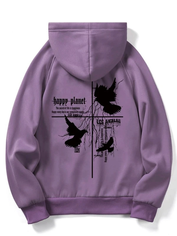 ROMWE Goth Men Slogan & Eagle Print Kangaroo Pocket Raglan Sleeve Drawstring Thermal Hoodie