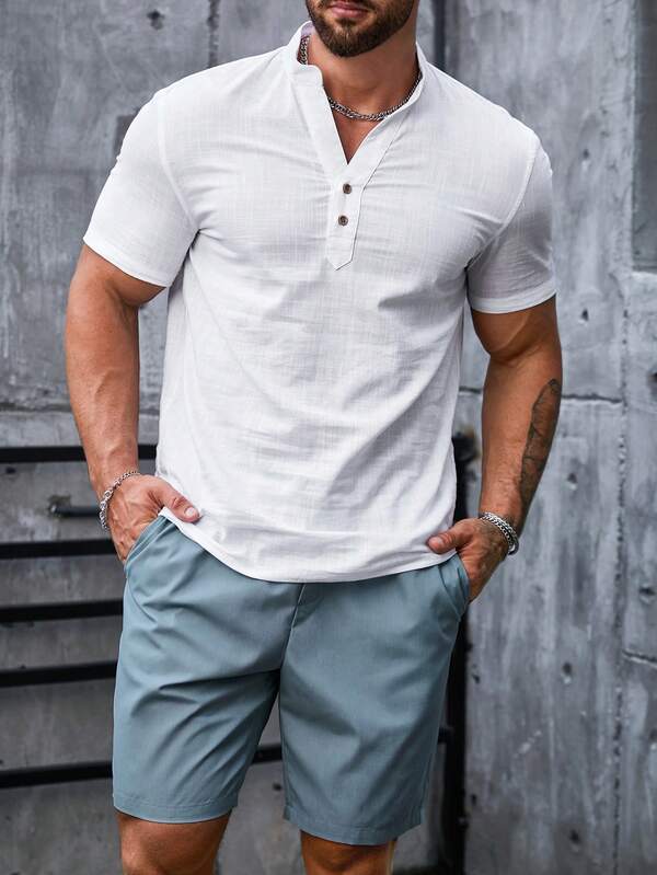 Manfinity Homme Men Solid Half Button Shirt & Drawstring Waist Shorts