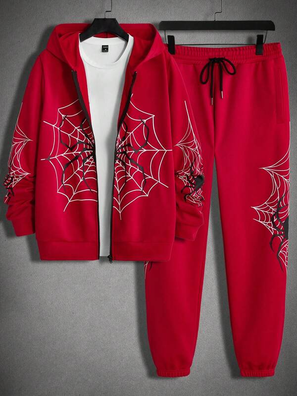 Manfinity EMRG Men Spider Web Print Zip Up Hoodie & Sweatpants Without Tee
