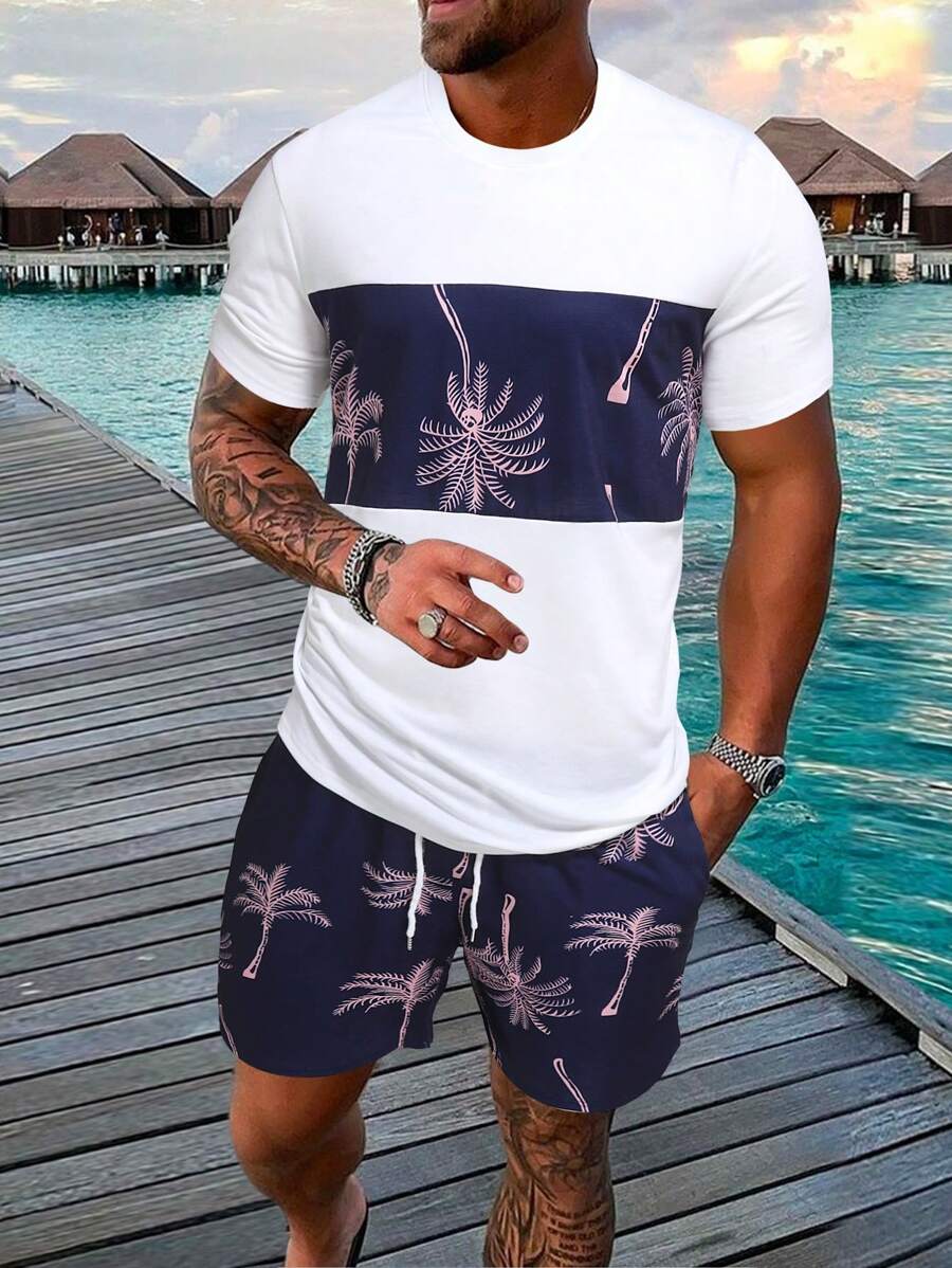 Manfinity Homme Men Tropical Print Tee & Drawstring Waist Shorts Set