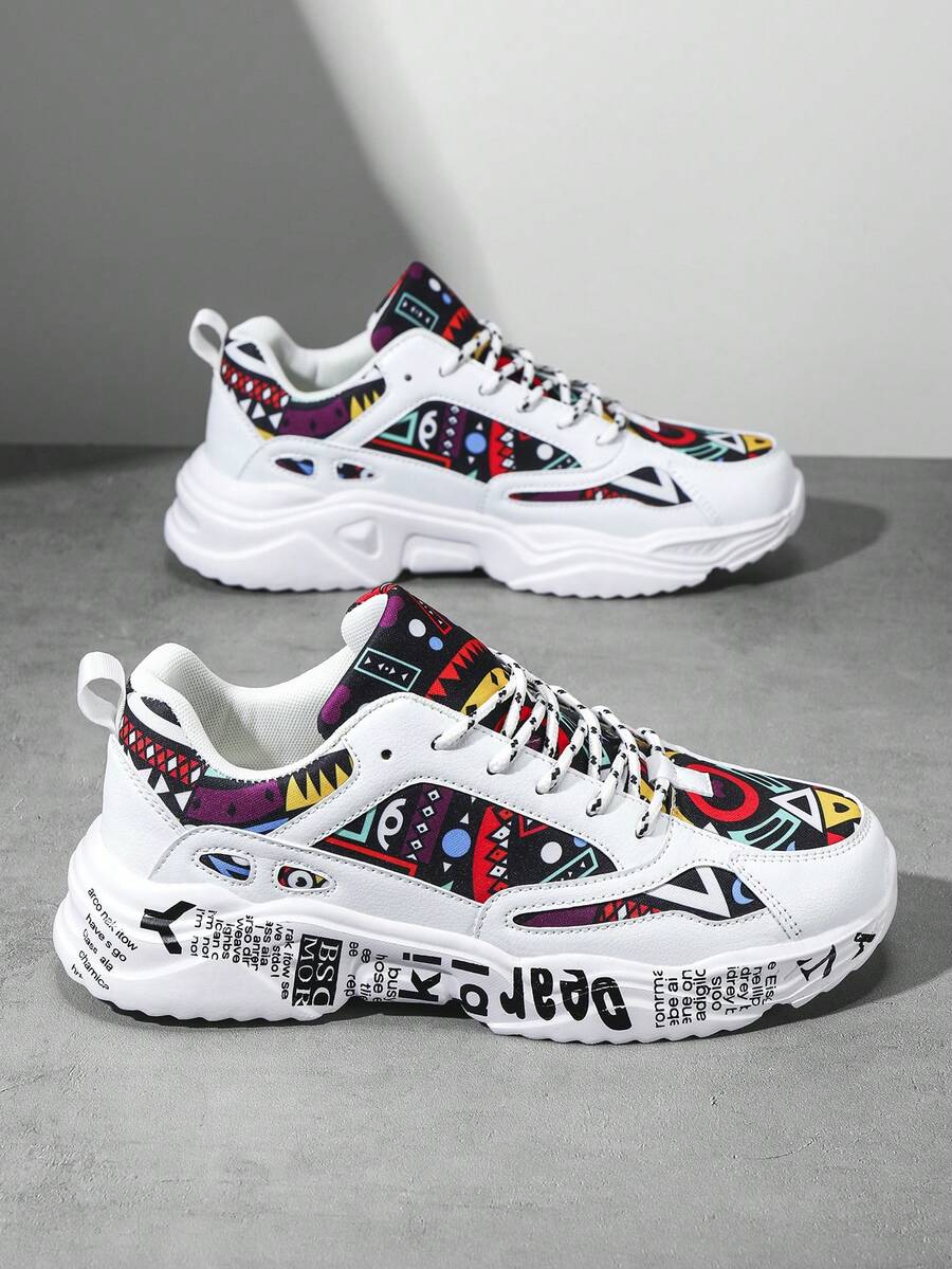 Men's Versatile Multi-Color Random Geometric Pattern Patchwork Chunky Sneakers, Fashionable Lace-Up Front Comfortable Lightweight Outdoor Sports Couples Sneakers ,Gym 2000s Style Valentine's Day Ideas