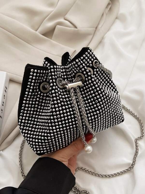 Mini Rhinestone & Faux Pearl Decor Chain Bucket Bag