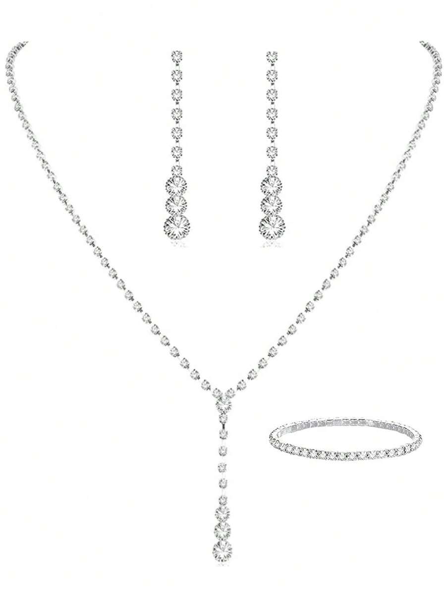 Minimalist Bridal Wedding Crystal Necklace, Earrings And Bracelet Set In Silver Tone, Fit For Wedding Rhinestone Necklaces, Bride And Bridesmaid