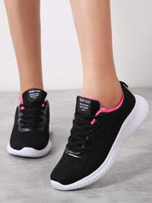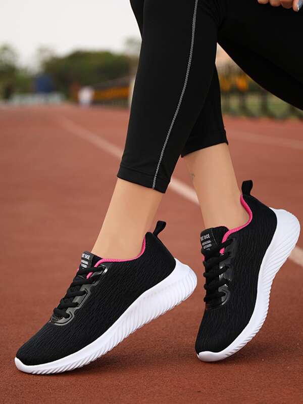 Minimalist Lace-up Front Knit Running Shoes, Women's Black Casual Sports Shoes