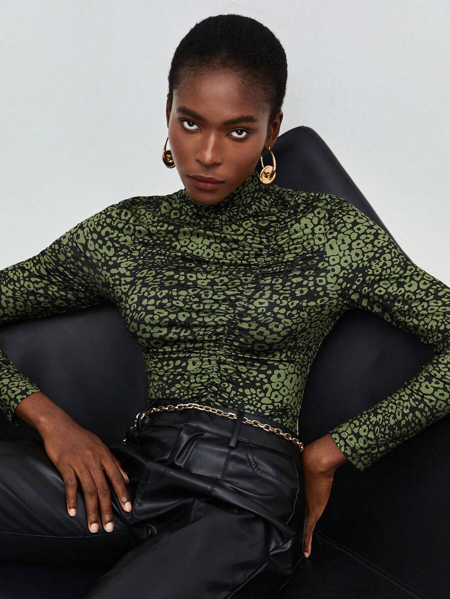 SHEIN BIZwear Mock Neck Leopard Print Ruched Front Tee
