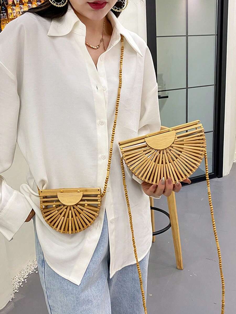 Fashion Half Moon Wooden Shoulder Crossbody Bags For Women Bamboo Woven Summer Beach Straw Bag Rattan Small Phone Purse Mini Bag