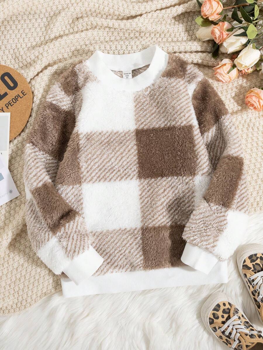 Mother And Daughter Matching Plaid Patchwork Fleece Sweatshirt In Multiple Colors For Daily Wear In Spring, Autumn And Winter