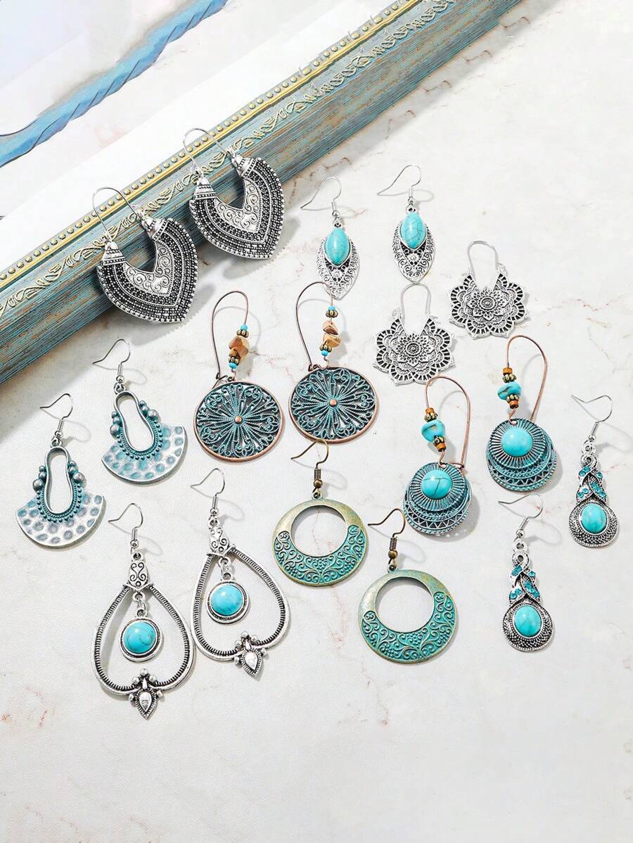 Multi-Layer Hollow Round Shape Turquoise Decor Dangle Earrings Retro Bohemian Style Alloy Jewelry Holiday Ear Ornaments
