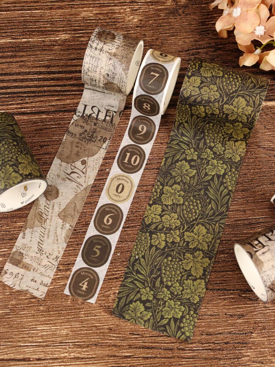Multisized And Paper Green Leaf Arabic & English Numerals Ink Painting Graffiti Journal Decoration Vintage Tape Set