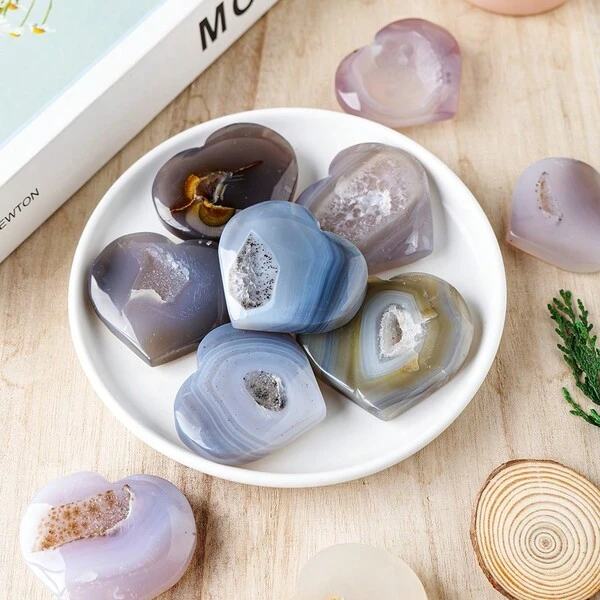 Natural Healing Crystal Agate Druzy Geode Heart Shape Love Carved Palm Worry Stone Chakra Reiki Balancing