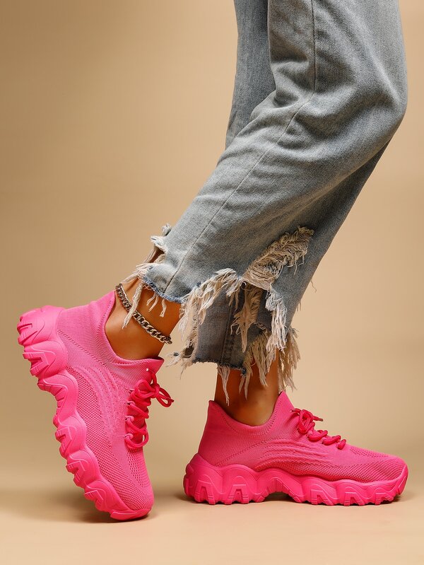 Neon Pink Lace-up Front Chunky For Women, Mesh Detail Sneakers