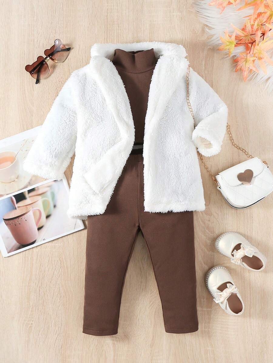 New Arrival Baby Girls' Stylish & Personalized Plush Coat, Turtleneck Top & Pants Set For Fall/Winter