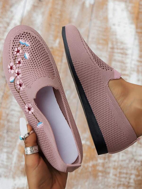New Arrival Breathable Slip-On Cloth Shoes Mom'S Embroidery Soft Sole Loafers With Floral Pattern Mesh Upper