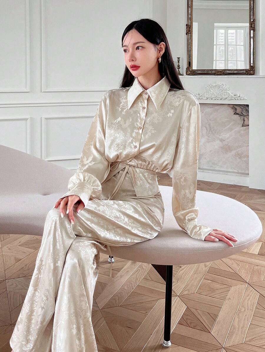 SHEINNeu New Chinese Style Jacquard Satin Cross Tie Long Sleeve Women's Blouse