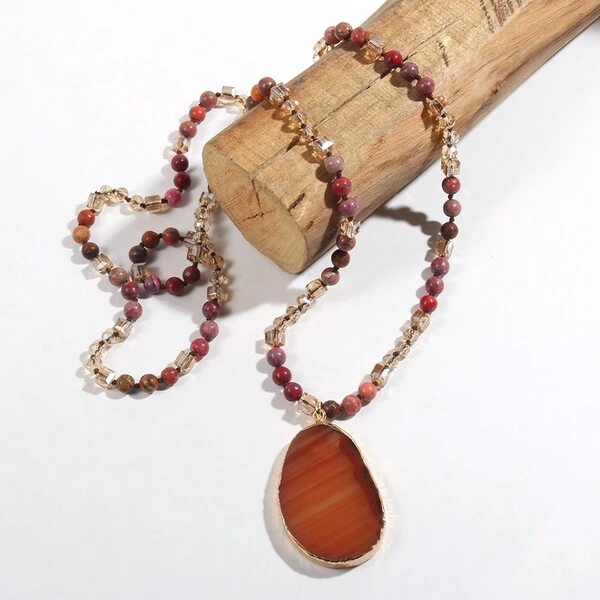 New Fashion Bohemian Style 6mm Natural Stone & Glass Bead Mixed Knotted Necklace With Stripe Agate Water Drop Pendant, Suitable For Women'S Daily Wear