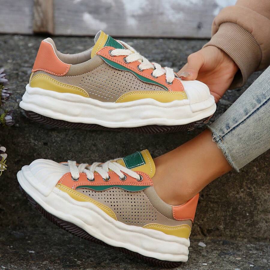 New Spring And Autumn Color-block Hollow Out Shell Toed Mesh Sneakers For Women, Breathable, Casual Sports Shoes With Thick Soles
