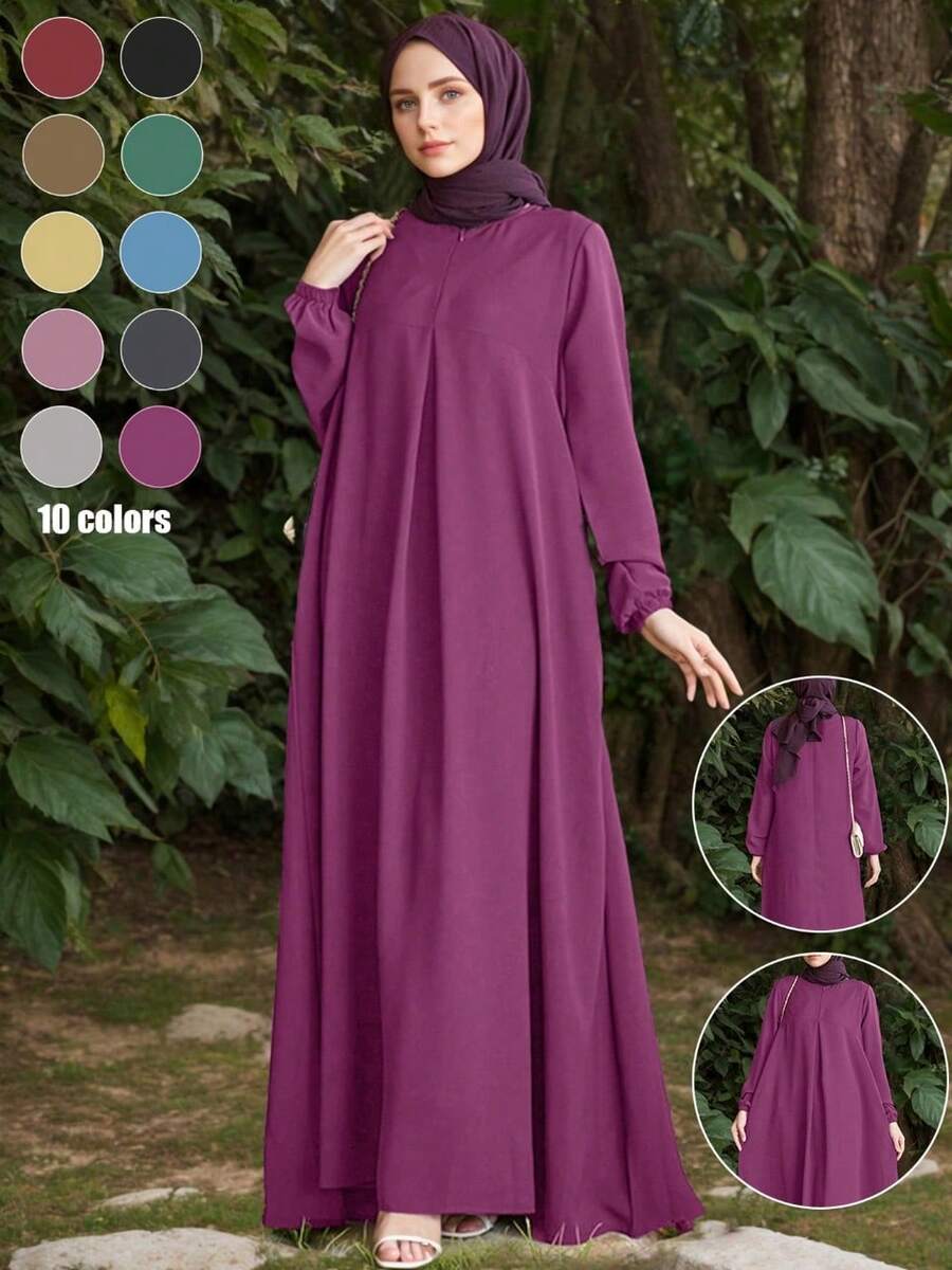 Elegant Long Sleeve Round Neck Kaftan Dress With Pockets, Women's Casual Simple Style, Made Of Comfortable Non-Stretch Woven Fabric