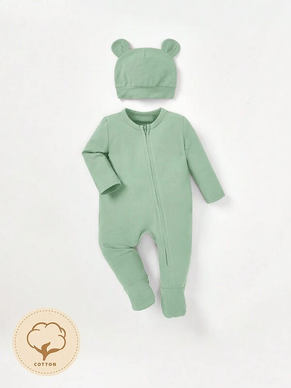 Cozy Cub Newborn Baby Boy Solid Zip Up Sleep Jumpsuit & 3D Ear Design Hat