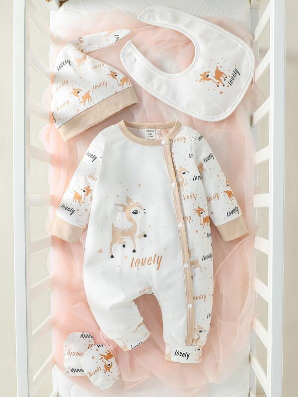 Newborn Baby Cartoon & Letter Graphic Jumpsuit & Hat & Bib & Gloves