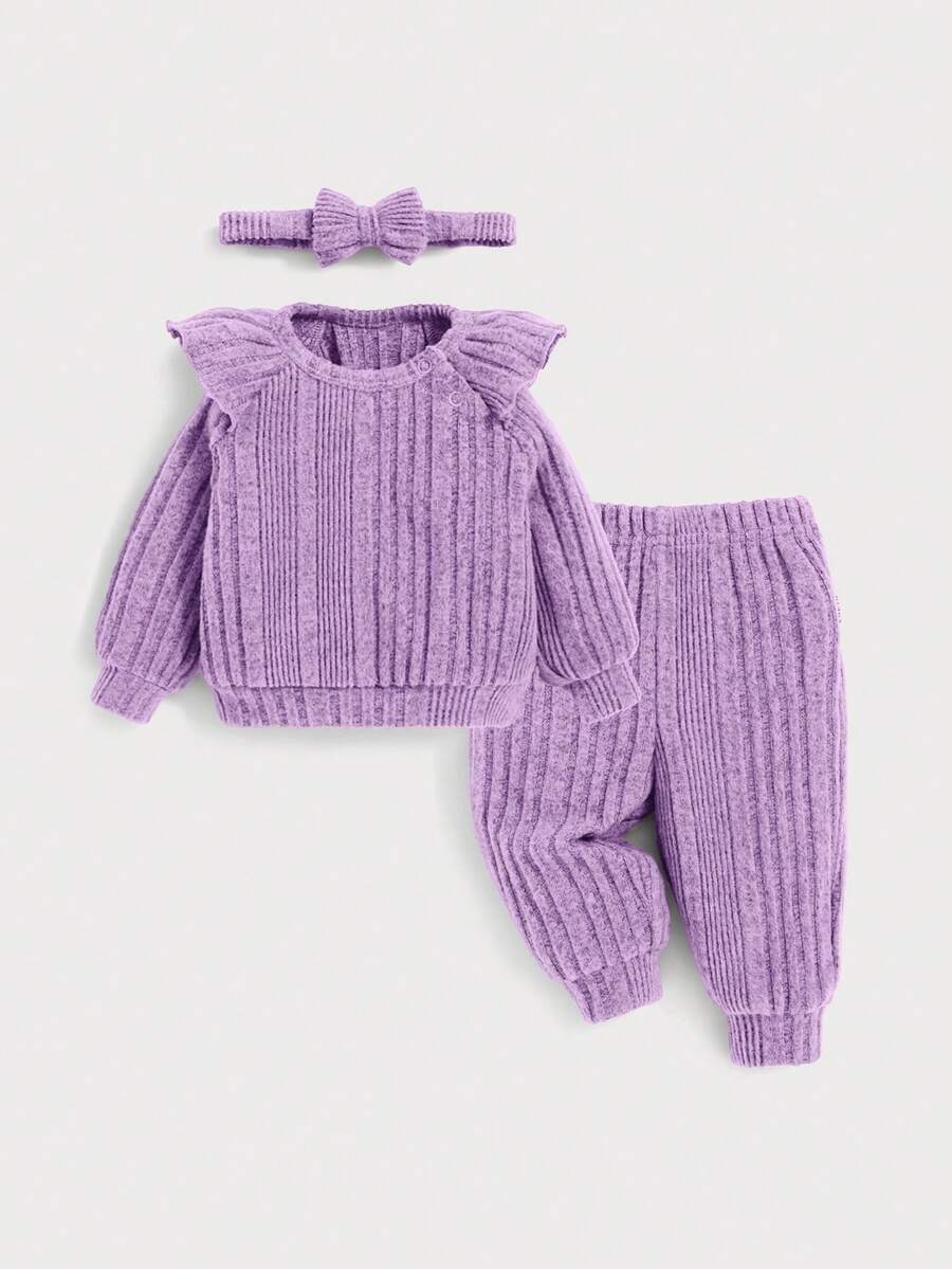 SHEIN Newborn Baby Girls' Solid Color Ruffle Edge Raglan Sleeve Top, Pants, And Headband 3 Piece Outfit Set