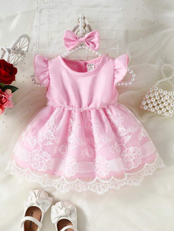 Newborn Baby Ruffle Trim Lace Overlay Dress