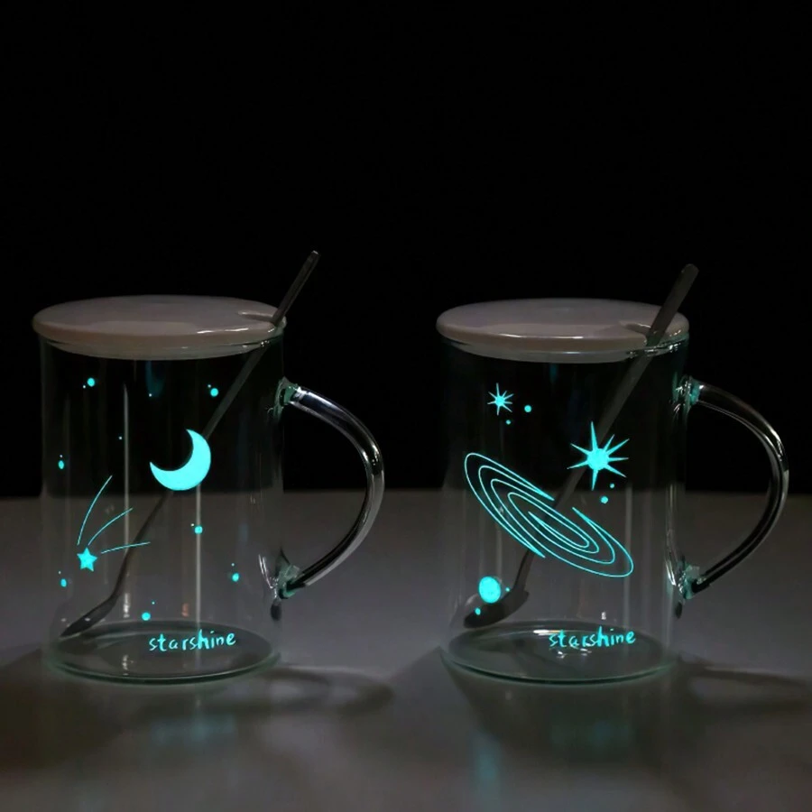 Night Light Heat-Resistant Glass Mug With Handle, Featuring Starry Sky Pattern, Suitable For Office Use, For Both Men And Women, Ideal For Drinking Water, Tea, And Coffee. Transparent Design, Comes With Lid And Spoon